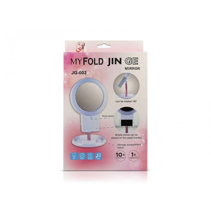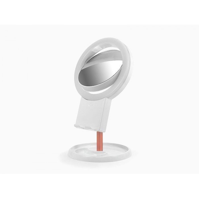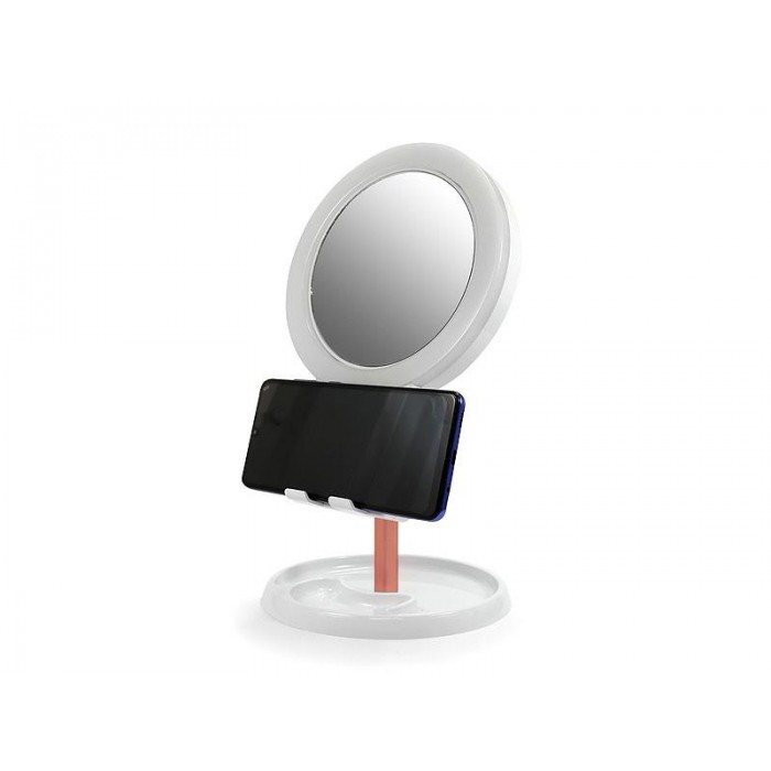 Косметическое зеркало с LED подсветкой и подставкой для телефона, имеет два зеркала. Настольное зеркало имеет 3 режима свечения: теплый белый, белый и холодный белый. Конструкция зеркала с подсветкой позволяет максимально комфортно использовать его для нанесения макияжа: можно отрегулировать угол наклона зеркала, а также вращать его на 360 градусов. На нижней части подставки имеются два отдела, в которые можно положить различные косметические принадлежности. На передней части конструкции есть подставка, в которую устанавливается телефон любой диагонали. Универсальная подставка подойдёт для телефонов разных размеров.