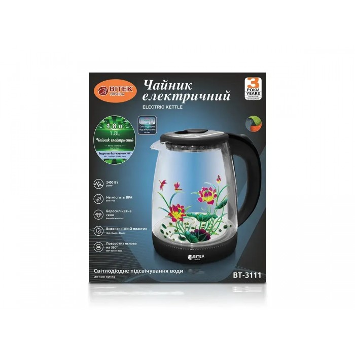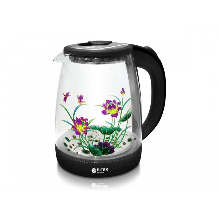 Купити Чайник електричний скляний з квіткою 1,8л 2400Вт синє LED-підсвічування BITEK BT-3111 12шт недорого оптом і в роздріб з доставкою по всій Україні ви можете на нашому сайті оптом.od.ua.