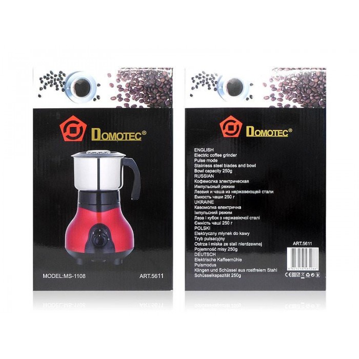 Стильная и мощная, электрическая кофемолка от Domotec, украсит интерьер вашей кухни и будет отлично выполнять свои функции, имеет несколько скоростных режимов.