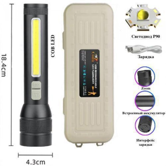 | Количество режимов работы, | 5 (100% P90, 50% P90, стробоскоп P90, 100% COB, 50% COB) |