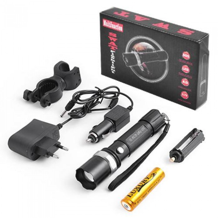 Комплектація: ліхтарик / акумулятор 18650 / ЗУ 220V / ЗУ 12V / касета для трьох батарей AAA / велокріплення