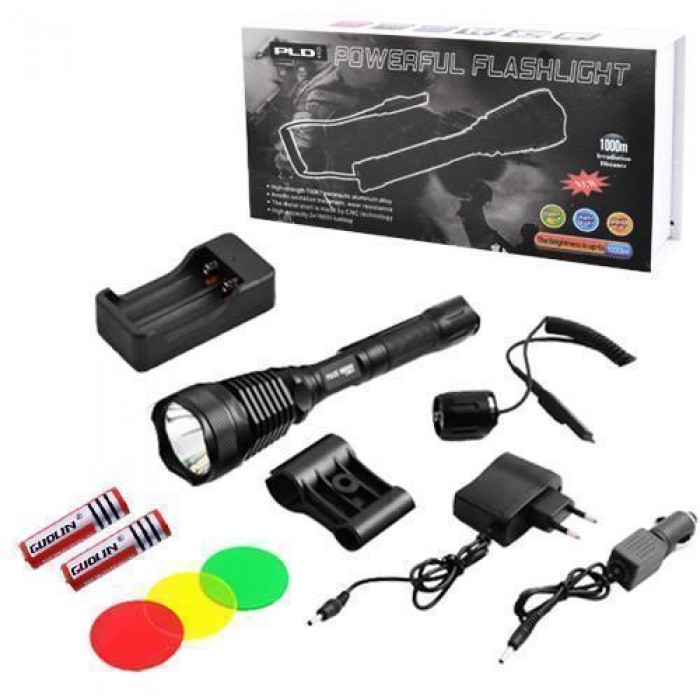 Комплектація: ліхтарик / фільтри-3шт / акумулятор 18650 - 2шт / З/У: 220V та 12V / кріплення під рушницю / виносна кнопка / подарункова коробка