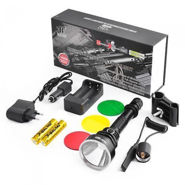 Комплектація: ліхтар / 2 x ак. 18650 / ЗУ 220 V / ЗУ 12 V / кріплення під рушницю / виносна кнопка / 3 фільтри (червоний, жовтий, зелений) / подарункова упаковка