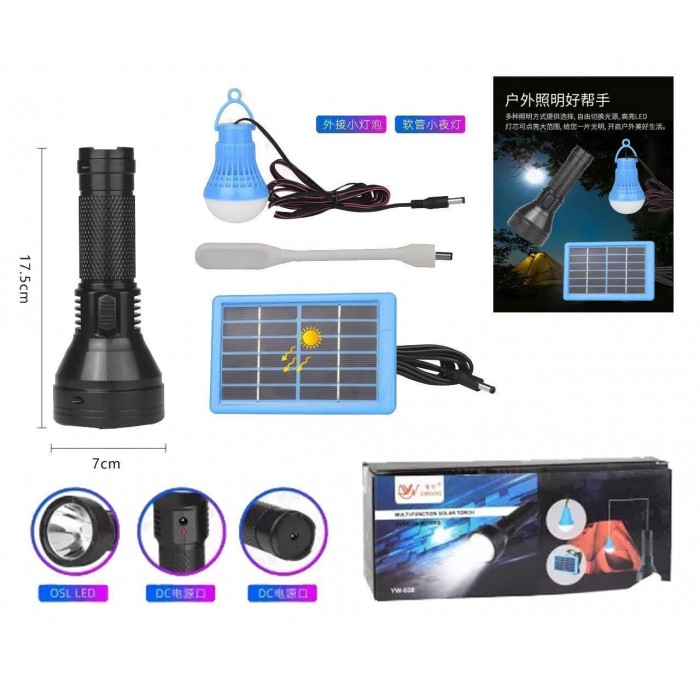 Комплектація: Ліхтарик ручний; Гнучка міні лампа; Лампа кругла; Сонячна панель; Картонна упаковка.
