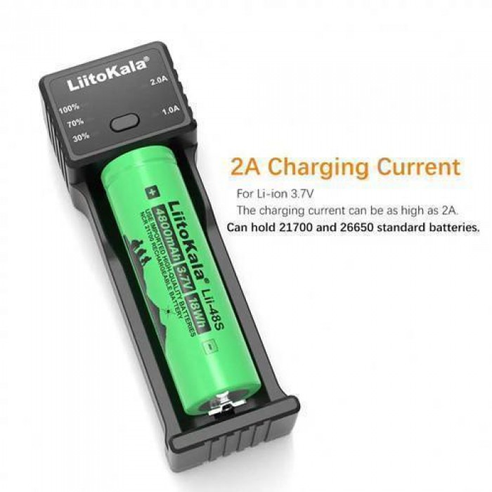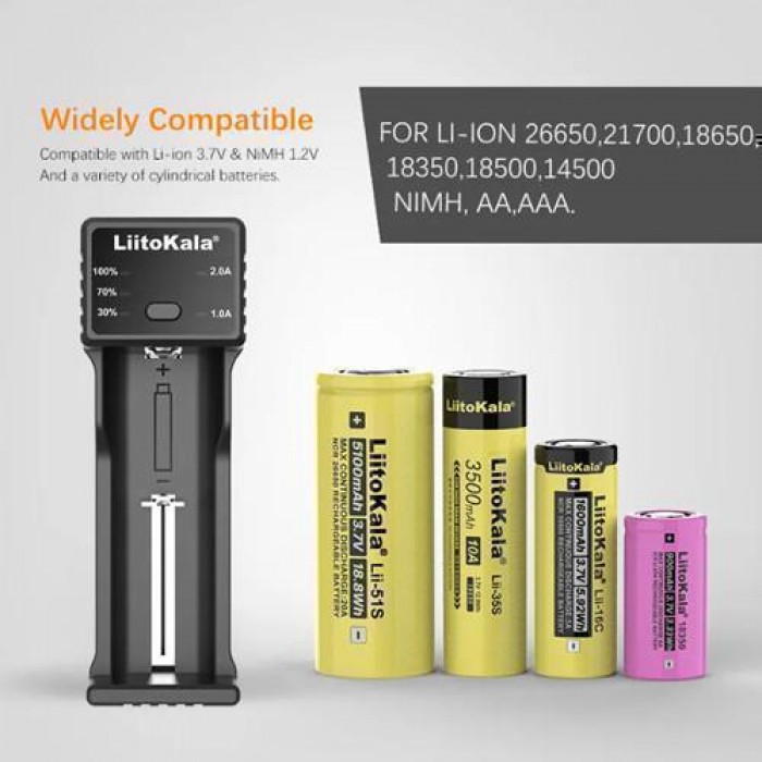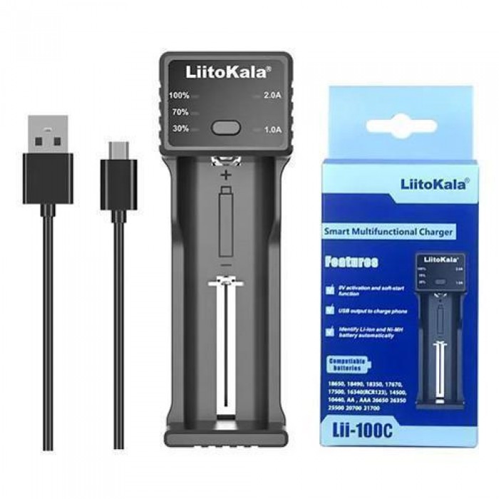 LiitoKala Lii-100C – універсальний одноканальний зарядний пристрій для NiCd, NiMH, Li-ion акумуляторів, зі струмом заряду до 2А, функцією Power Bank та можливістю встановлення акумуляторів довжиною до 72мм.