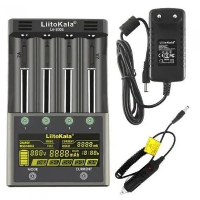 3. Світлодіодний індикатор заряджання може відображати стан заряду 25% 50% 75% 100% також може відображати тип батареї NiMH 1,2, Li-Fe 3,2, Li-ion 3,7, Li-ion 3, 80 В (IMR) (у комплекті йде адаптер 12V3A та автомобільний зарядний пристрій)