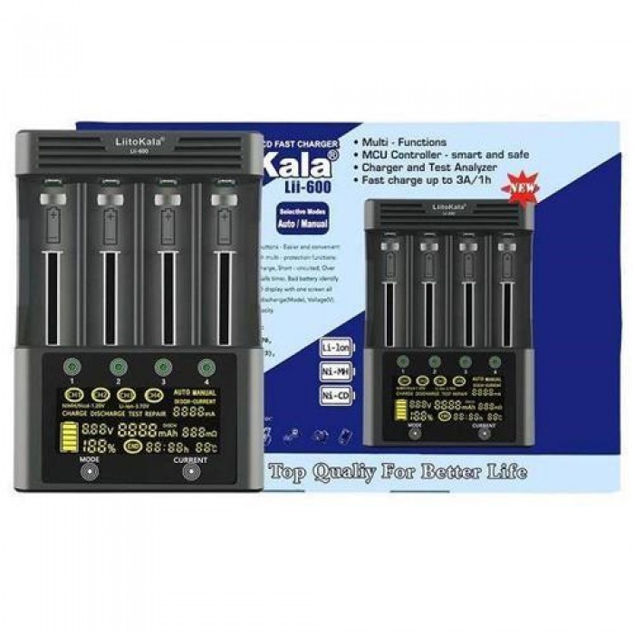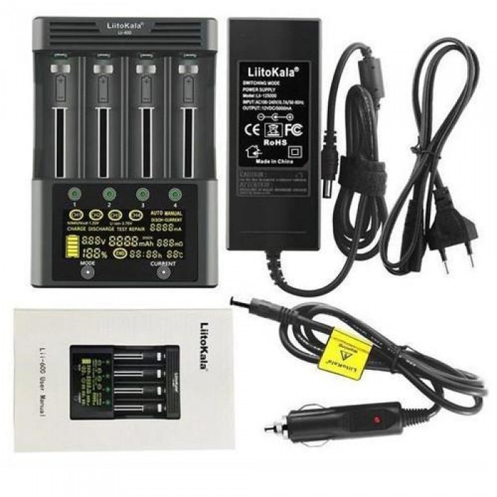 3. Світлодіодний індикатор заряджання може відображати стан заряду 25% 50% 75% 100% також може відображати тип батареї NiMH 1,2, Li-Fe 3,2, Li-ion 3,7, Li-ion 3, 80 В (IMR) (у комплектацію входить адаптер 12V3A та автомобільний зарядний пристрій)